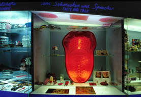 Die Zunge dient zum Sprechen und Schmecken - kein Organ ist enger mit dem Motto der Ausstellung verbunden: "Essen ist Kommunikation." Eine riesige Zunge, zusammengesetzt aus mehr als 600 kleinen Nahaufnahmen von Zungen, hängt an einer Wand der Ausstellungshalle.
